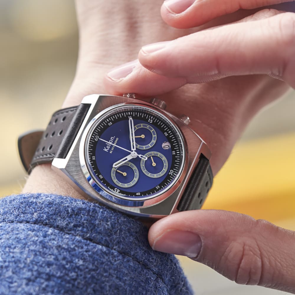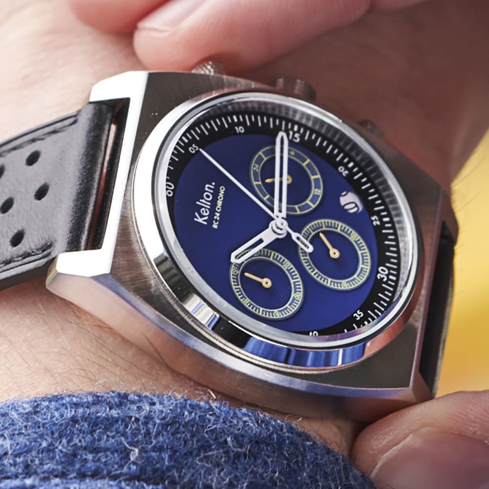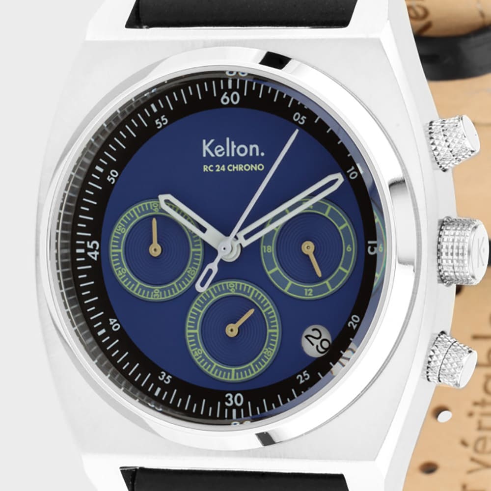 O nas Kelton RC 24 Chrono Chrono Meca-Quartz Niebieski? Niebieska tarcza z luminescencyjnymi znacznikami Super-LumiNova odbija światło lampy, podobnie jak dodatkowe subtarcze (60-minutowa i 24-godzinna). Nie krzyczę „patrzcie na mnie”, ale wszyscy to zauważają: ten facet ma gust i nie potrzebuje go.