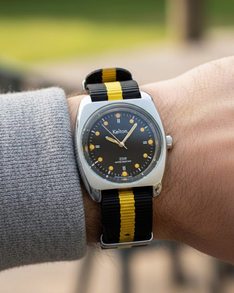 Czarna tarcza i żółte indeksy w połączeniu z wytrzymałym paskiem NATO tworzą zegarek Kelton RC2, który przyciąga spojrzenia.