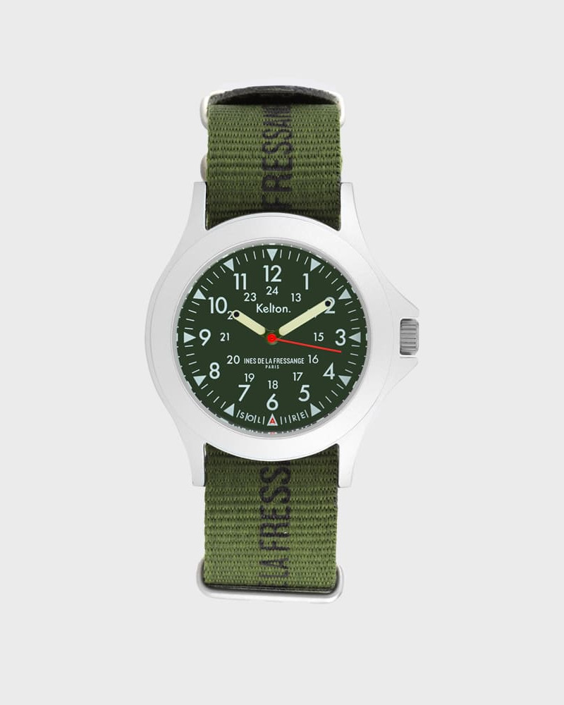 Kelton Solaire Field Kaki x Ines de la Fressange Paris sportowy zegarek solarny kolorowy zieloną tarczą + pasek khaki
