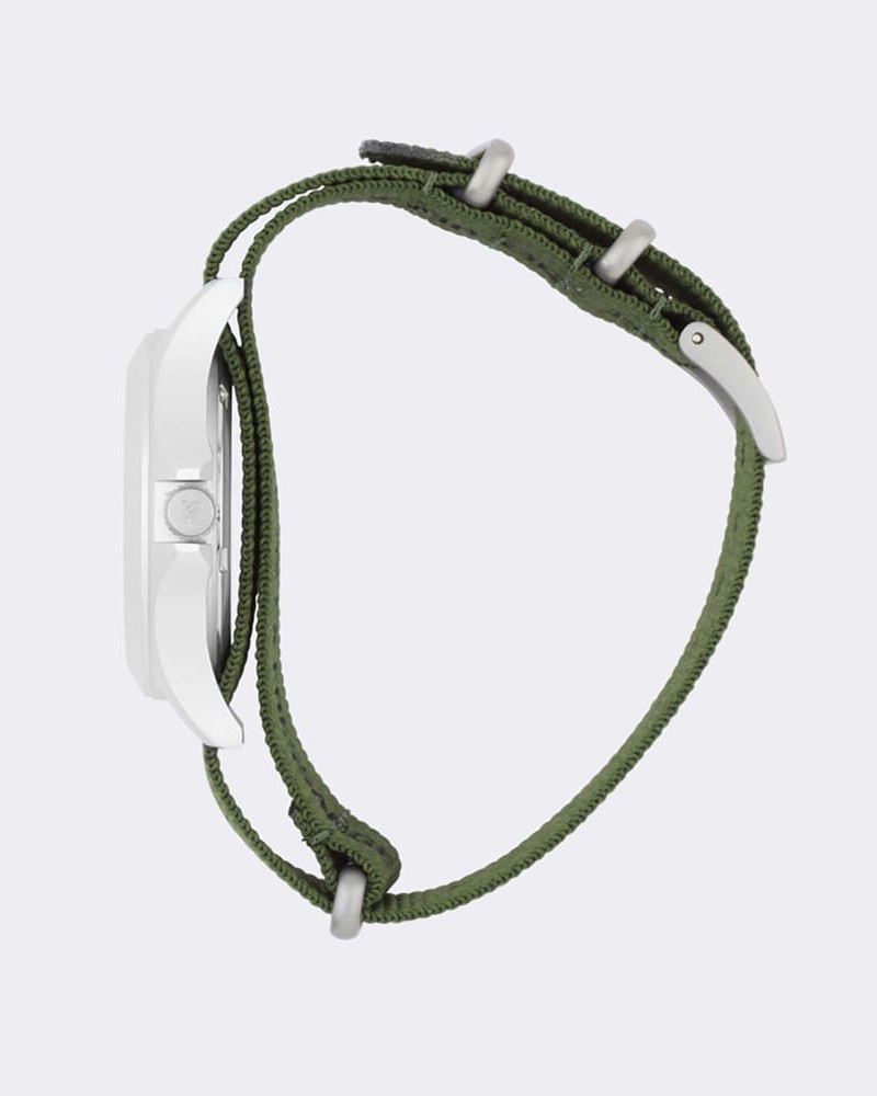 Jego kaki zielona tarcza i tekstylny pasek RPET w naturalnych barwach odwołują się do inspiracji militarnymi motywami i naturą. Lekka koperta z aluminium i minimalistyczny design tworzą model, który doskonale wpisuje się w miejskie i weekendowe outfity.