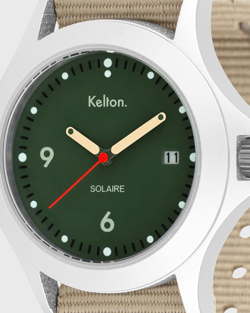 Kelton Solaire Soleil Vert Nato Sand sportowy zegarek solarny kolorowy zieloną tarczą + beżowy pasek