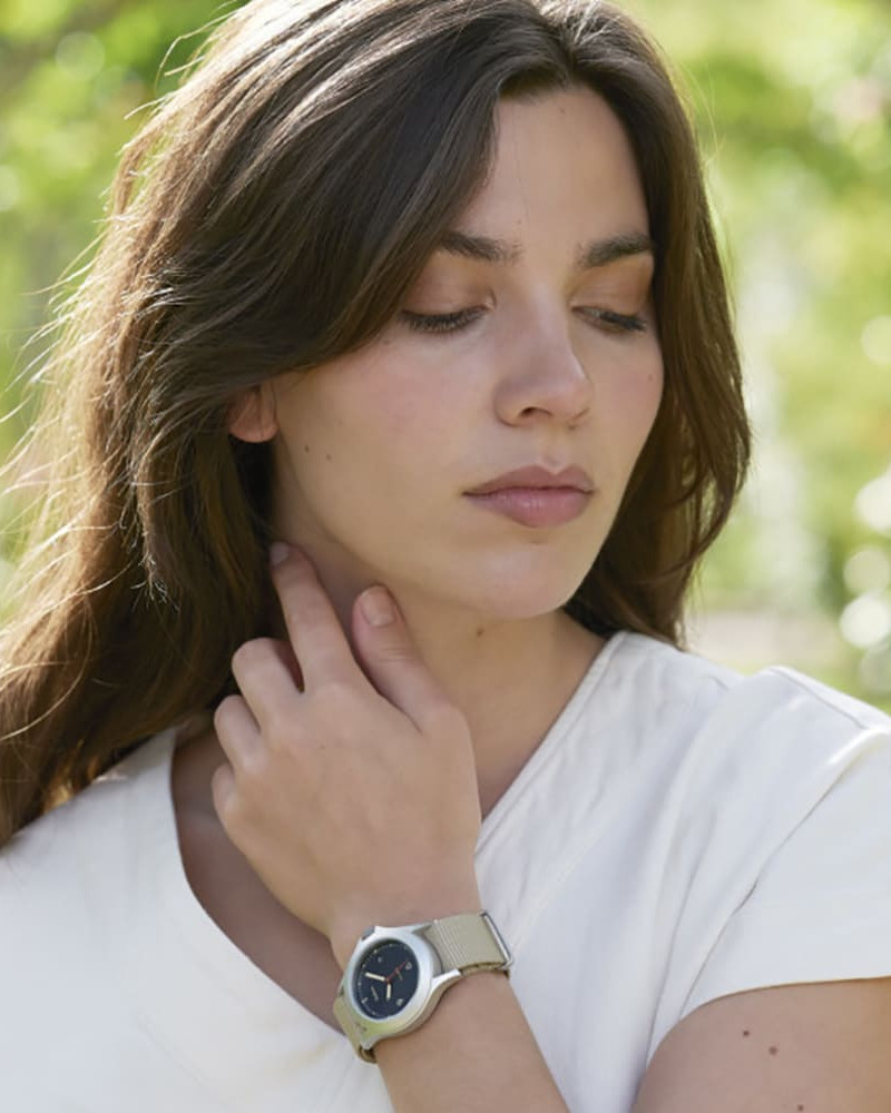 Koperta ze szczotkowanego aluminium jest lekka i trwała, a pasek NATO w stonowanym beżowym kolorze dodaje casualowego charakteru i komfortu noszenia. Dzięki temu zegarek łączy praktyczność, nowoczesne rozwiązania i swobodny styl w jednym uniwersalnym modelu.