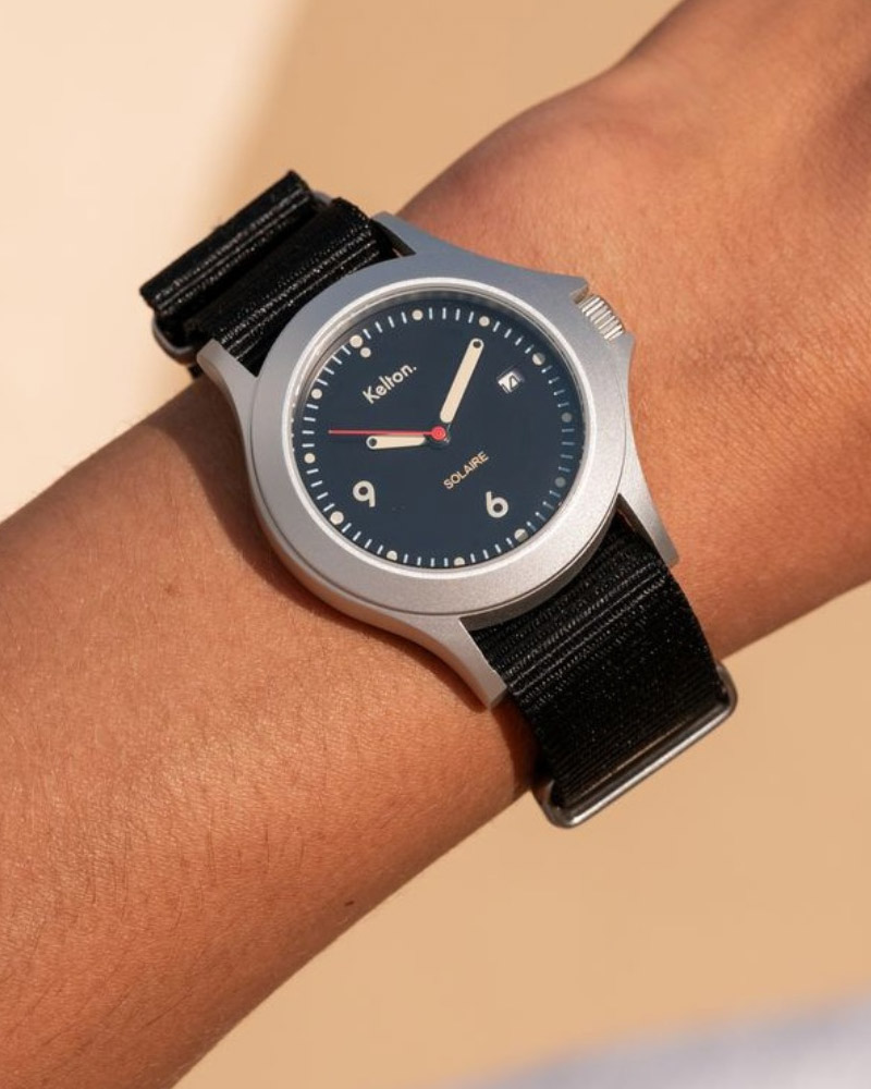 Model Green Sun Solar to przykład innowacyjnego zegarka z kolekcji zegarki solarne Kelton — jego mechanizm przetwarza światło (naturalne lub sztuczne) na energię, dzięki czemu nie wymaga wymiany baterii przez cały okres użytkowania. Koperta ze szczotkowanego aluminium jest lekka i trwała, a czarny pasek NATO dodaje uniwersalnego, casualowego charakteru.